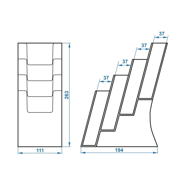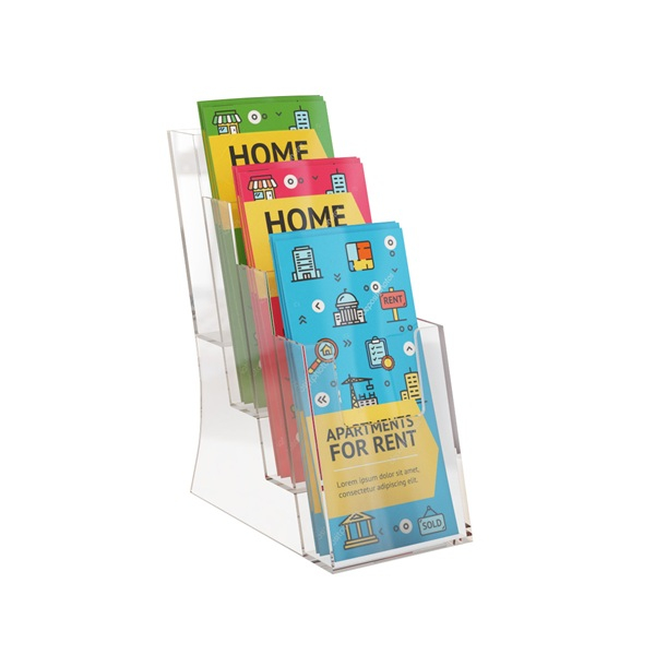 Держатель буклетов настольный "Квартет" 1/3 А-4 4-секции — прозрачная подставка для каталогов и буклетов с 4 секциями для рекламных материалов узкого формата 1/3А4. материал кармана: литьевой полистирол; толщина стенки кармана: 2 мм. Особенности: вмещает пачку бумаг толщиной до 148 мм. наклоненная задняя стенка каждой секции обеспечивает комфортный угол подачи информации. Применение: можно использовать на выставке, разместить на столе, стойке-ресепшн, в прикассовой зоне или другом месте, доступном для посетителей.