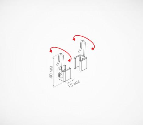 Крючок с подвижным основанием для крепления пластиковых рамок на подвесных профилях и металлических покупательских корзинах. Для подвешивания одной рамки необходимо два крючка разной ориентации (правый и левый). Закрепляются с боковых сторон рамки. Основание изготовлено из прозрачного ударопрочного пластика, крючок из стальной проволоки.