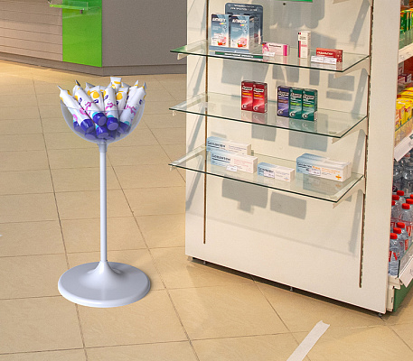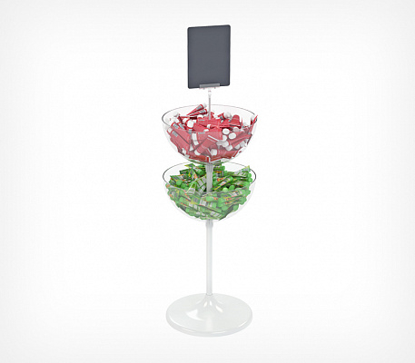 Дисплей состоит из прозрачной пластиковой чаши объемом 24 литра, металлической опорной «ноги» и устойчивого пластикового основания белого цвета. Чаша для выкладки является цельнолитой, что гарантирует её долгую эксплуатацию.