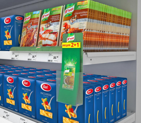 Держатель вывески на струбцине с двумя отверстиями и отгибом позволяет крепить конструкции к полкам толщиной до 40 мм, оснащенными ценниками или бортиками. Предназначен для различных вывесок, "паразитных" дисплеев и прочих конструкций из пластика, металла, картона.