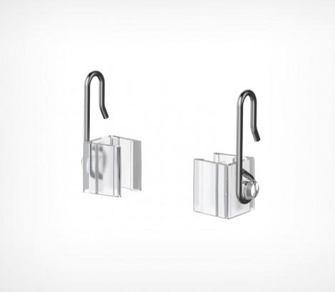 Крючок с подвижным основанием для крепления пластиковых рамок на подвесных профилях и металлических покупательских корзинах. Для подвешивания одной рамки необходимо два крючка разной ориентации (правый и левый). Закрепляются с боковых сторон рамки. Основание изготовлено из прозрачного ударопрочного пластика, крючок из стальной проволоки.