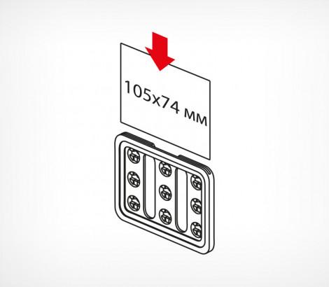 Универсальная рамка-ценникодержатель с 2 гнездами для крепления рамки на разных уровнях относительно полки. Прорезь для вставки по широкой стороне рамки. Размер вставки - 74×53 мм.