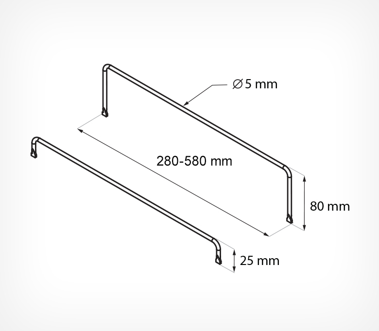 Разделитель прутковый MET-DIV — предназначен для разделения товаров на полке роллерной системы FORTA ROLLER. Высота разделителя варьируется в зависимости от высоты товара и должна составлять не менее 1/3 от высоты продукта. Стандарты высот: 25 и 80 мм. Изготовлен из особо прочной стали, что обеспечивает долговечность и устойчивость. Применяется для большинства продуктов, включая тяжёлые напитки и лёгкие товары с большой плоской боковой поверхностью.