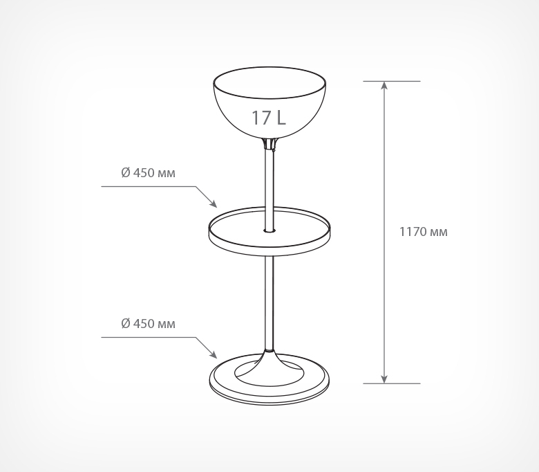 Дисплей UNIBOWL-17-RX предназначен для выкладки продовольственных и непродовольственных товаров в компактной упаковке. Позволяет делать выкладку товаров в неустойчивой упаковке в чаше и в стандартной упаковке на полке. Состав дисплея: пластиковое основание, труба длиной 520 мм, труба — 410 мм, пластиковая полка, пластиковая прозрачная чаша объёмом 17 литров, заглушка, защищающая полость трубы. Габаритные размеры: высота — 1170 мм, диаметр основания — 450 мм. Может использоваться с дополнительными опциями: информационной рамкой, ценниками, разделителями внутреннего пространства чаш, прозрачными бортиками для полки, которые приобретаются отдельно.