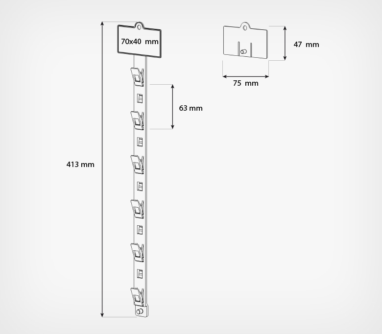Топпер для подвесной пластиковой страйп-ленты. Предназначен для крепления пластиковой страйп-ленты и размещения ценников или рекламных наклеек. Используется вместе со страйп-лентой для товаров в небольшой упаковке без отверстия для подвеса. В верхней части топпера предусмотрено отверстие для крепления с помощью специального металлического крючка для страйп-лент или хомута.
